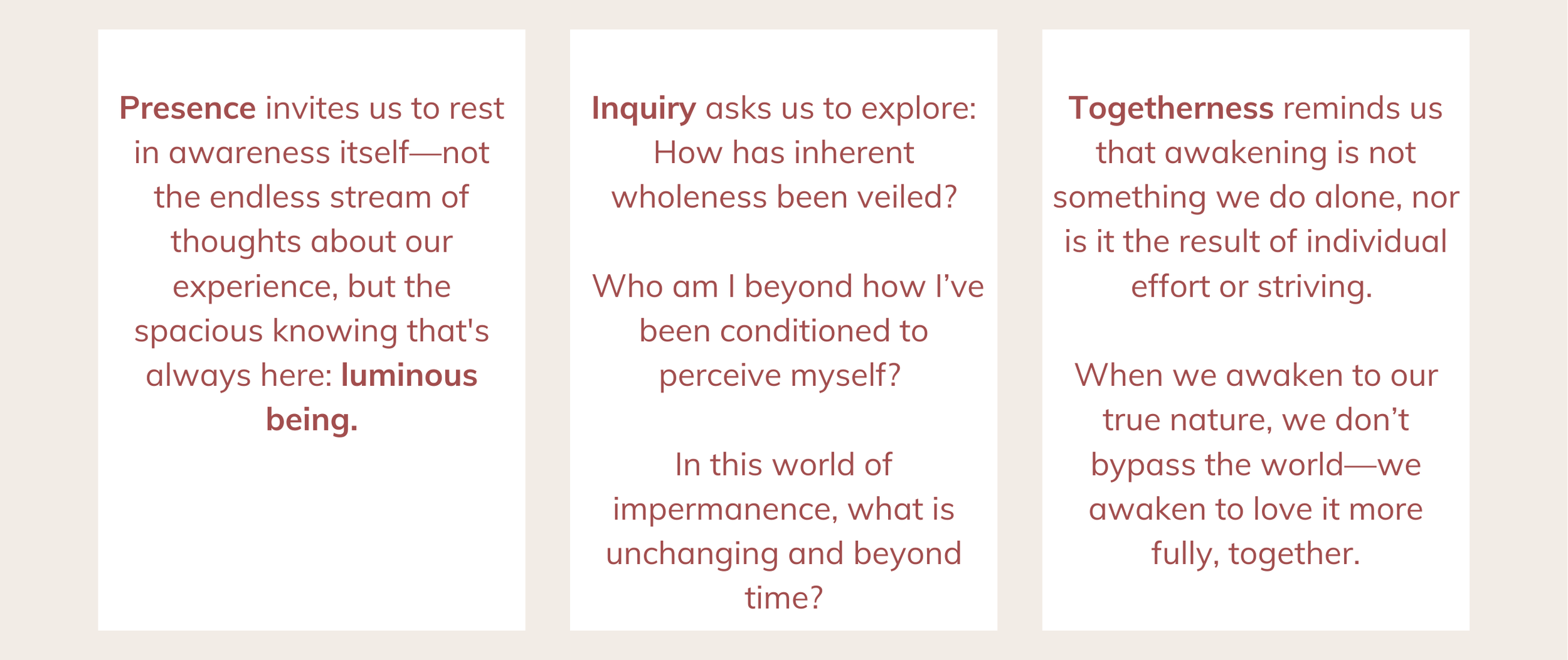 techniques or self-improvement strategies, but through presence, inquiry, and togetherness.